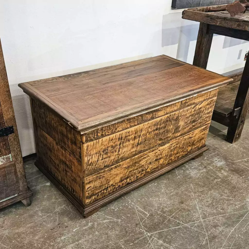 Explore a elegância do Baú em Demolição Médio de Assoalho com Tampa B Encerado. Seu design único e acabamento encerado tornam-no uma peça funcional e sofisticada, é uma peça única, feita de madeira rústica e cheia de história. Ideal para decorar sua sala de estar ou quarto com um toque vintage e funcional.