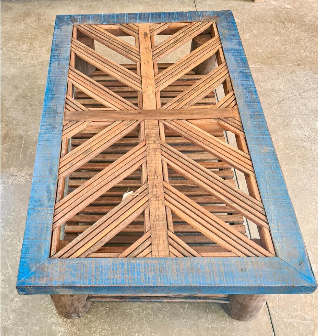 Mesa de Centro Retangular Espaçada Ripada com Borda Azul: Charme e Aconchego
